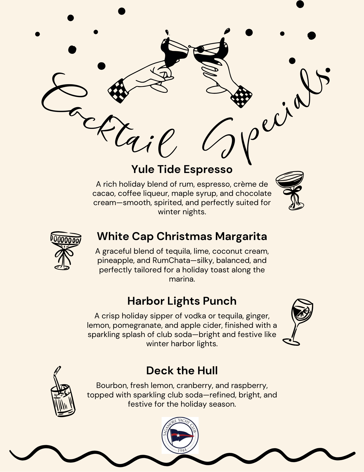 Specials are year round and adjusted seasonally to bring a little bit of home away from home at Sagamore. Our menu is carefully designed to meet a wide range of comfort and seasonal specialty. We are always open to suggestions and work with our member families to build something for everyone.